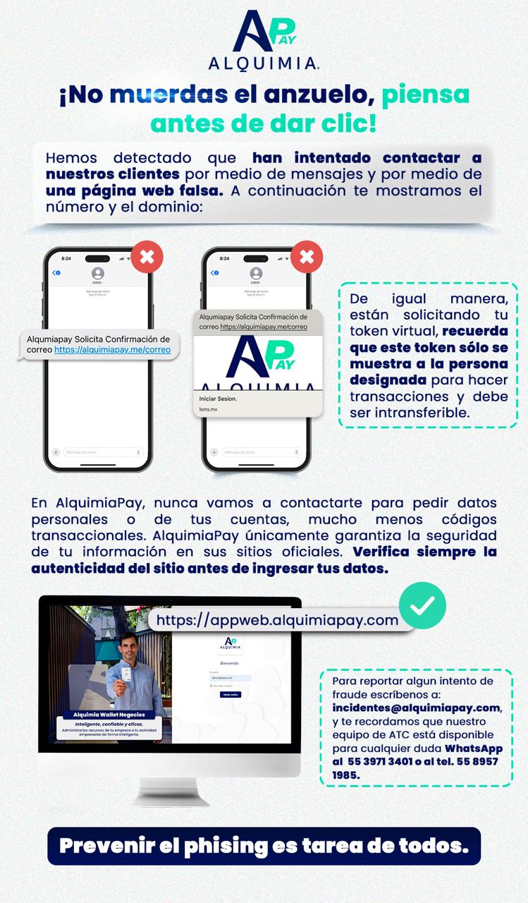 Les informamos que los materiales, servicios e información oficial de AlquimiaPay es la publicada en esta página y en nuestras redes sociales oficiales, cualquier otro material divulgado en otro medio digital o impreso no reconocemos su procedencia ni contenido.